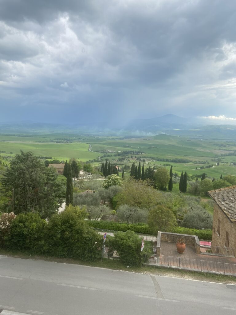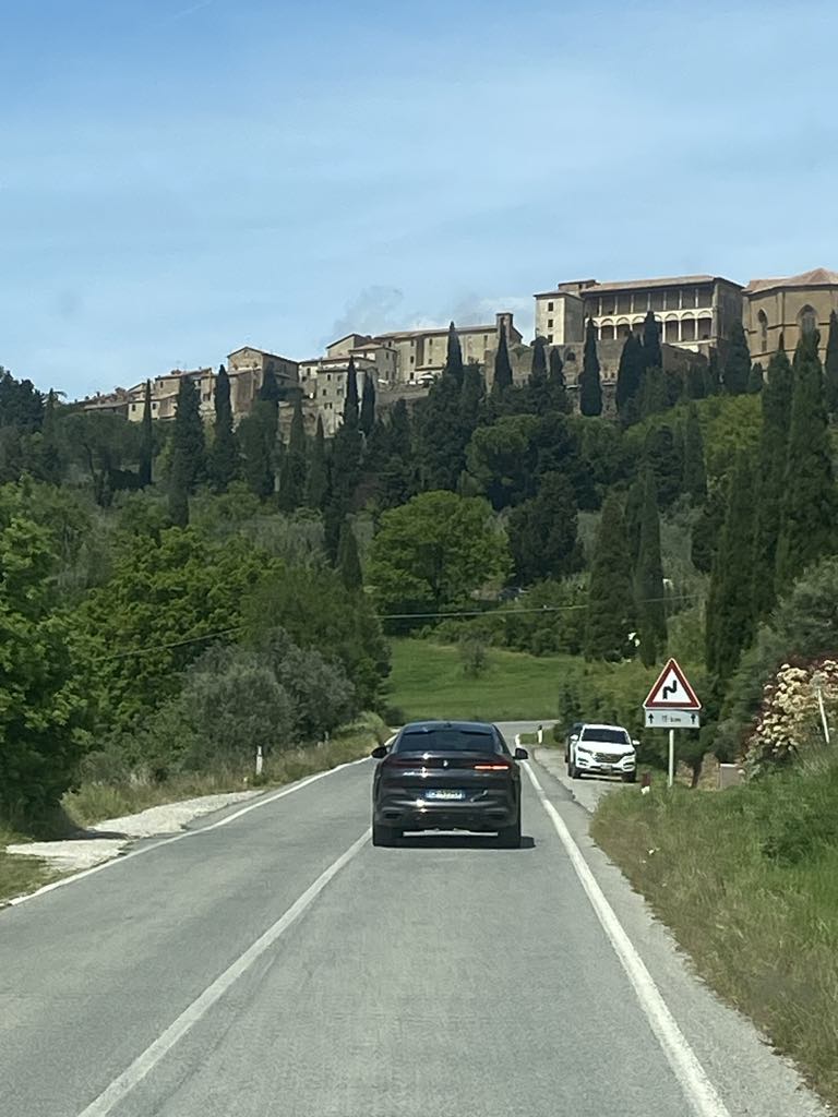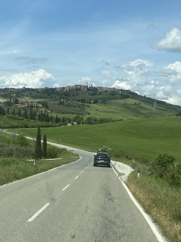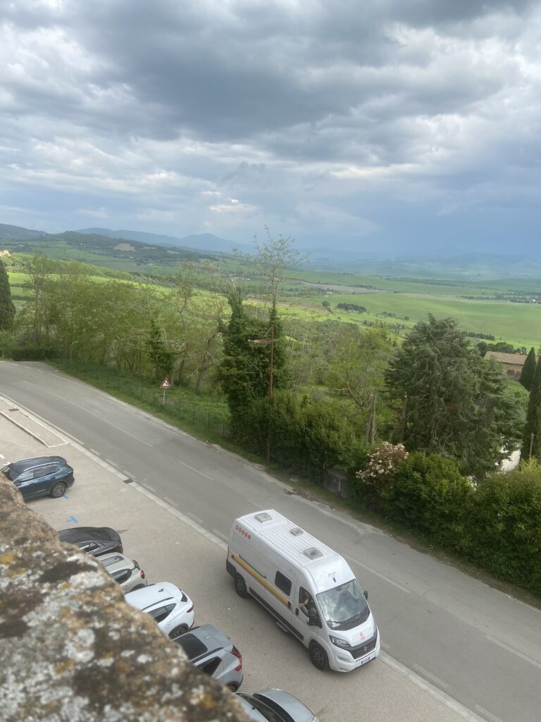 Det typiske Toscanske landskab og til sidst Pienza dukkede op i horisonten. Bær lige over med kvaliteten af billederne de er taget ud af vinduerne på camperen.