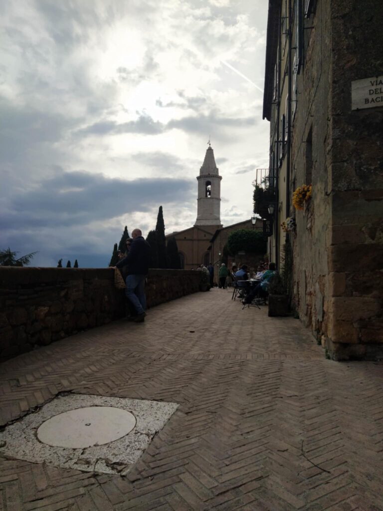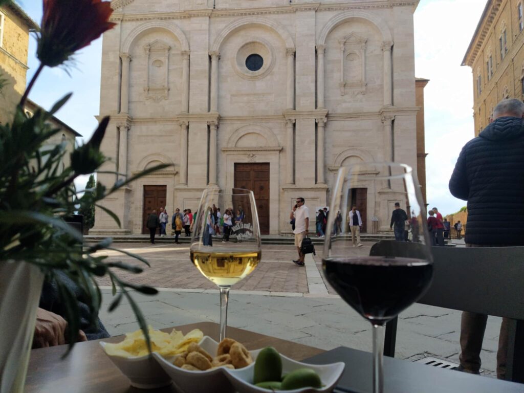 Ved 16 tiden sad vi så på kirkepladsen i Pienza, på caffe la posta, og ligesom i 17 måtte vi fejre ankomsten med et glas vin, det var faktisk meget rørende at være her igen.