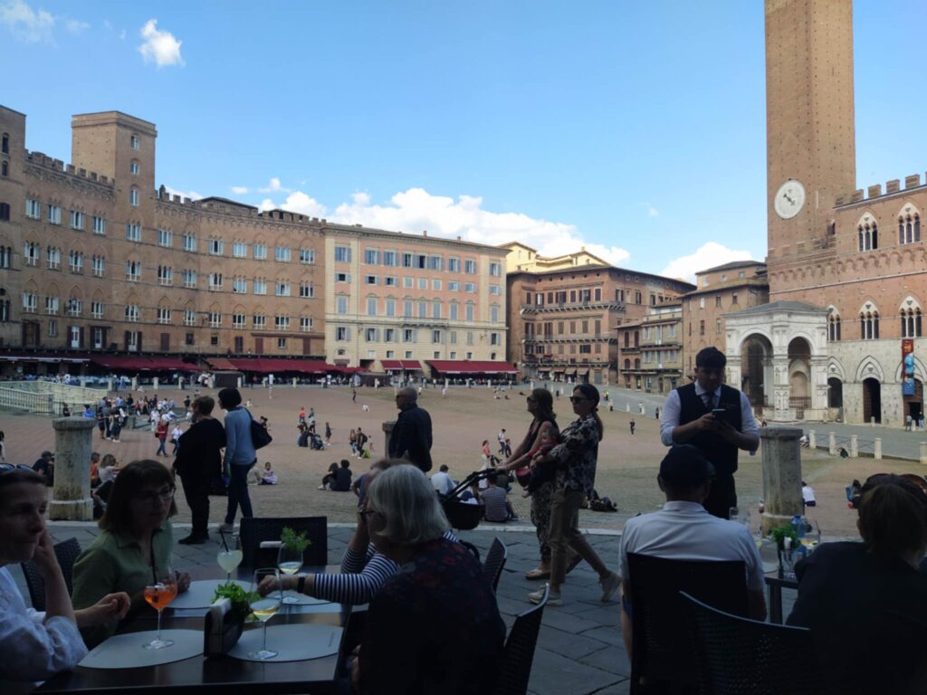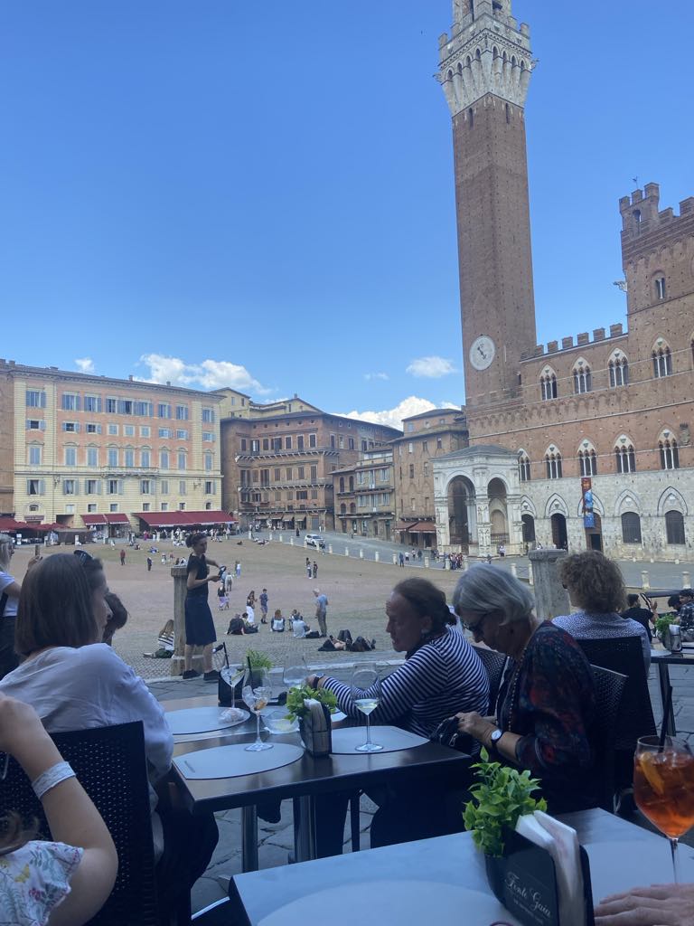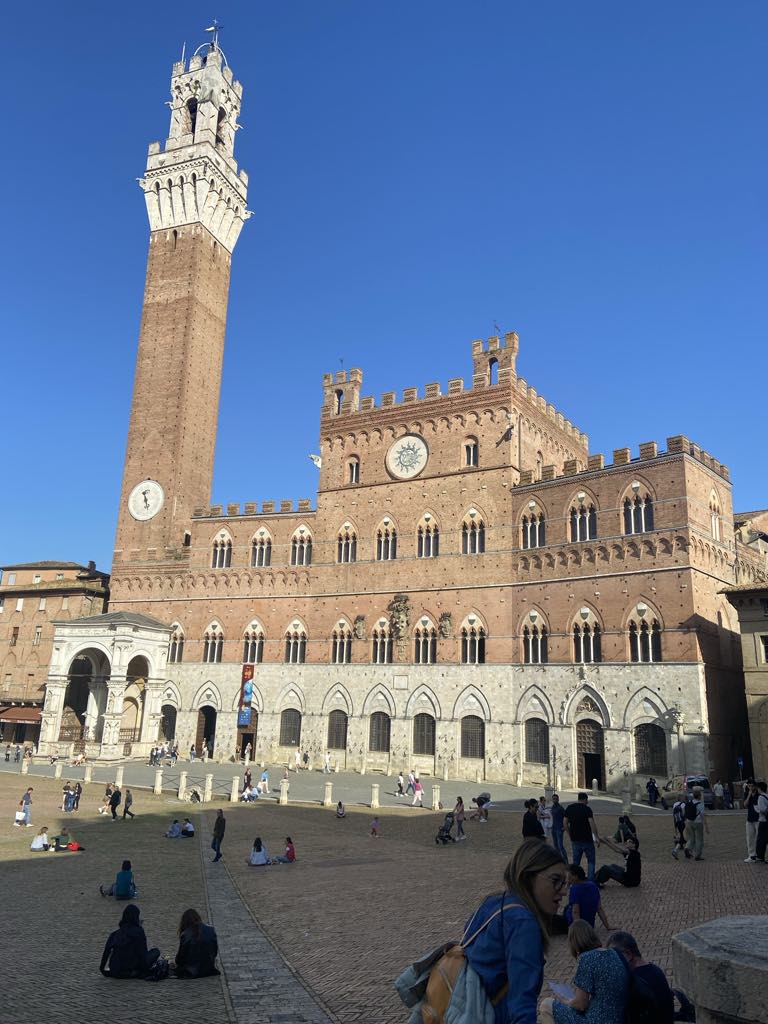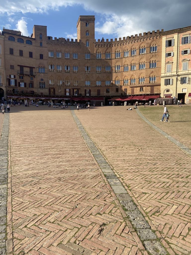 Hovedvejen førte os hurtigt de 10 km ind til Porta Romania, som vi erfarede var opført i 1100-tallet! Den snævre gade ledte os ind til Piazza del Campo, som vi genså med glæde. Vi har gode minder herfra, fra vi var her med Carina og Kristian tilbage i 2017. Fra en café over to kopper kaffe indhalerede vi stemningen på denne smukke plads formet som en muslingeskal. Den ene side af pladsen domineres af Palazzo di Pubblico, som Nyrop blev inspireret af, da han tegnede Københavns Rådhus.