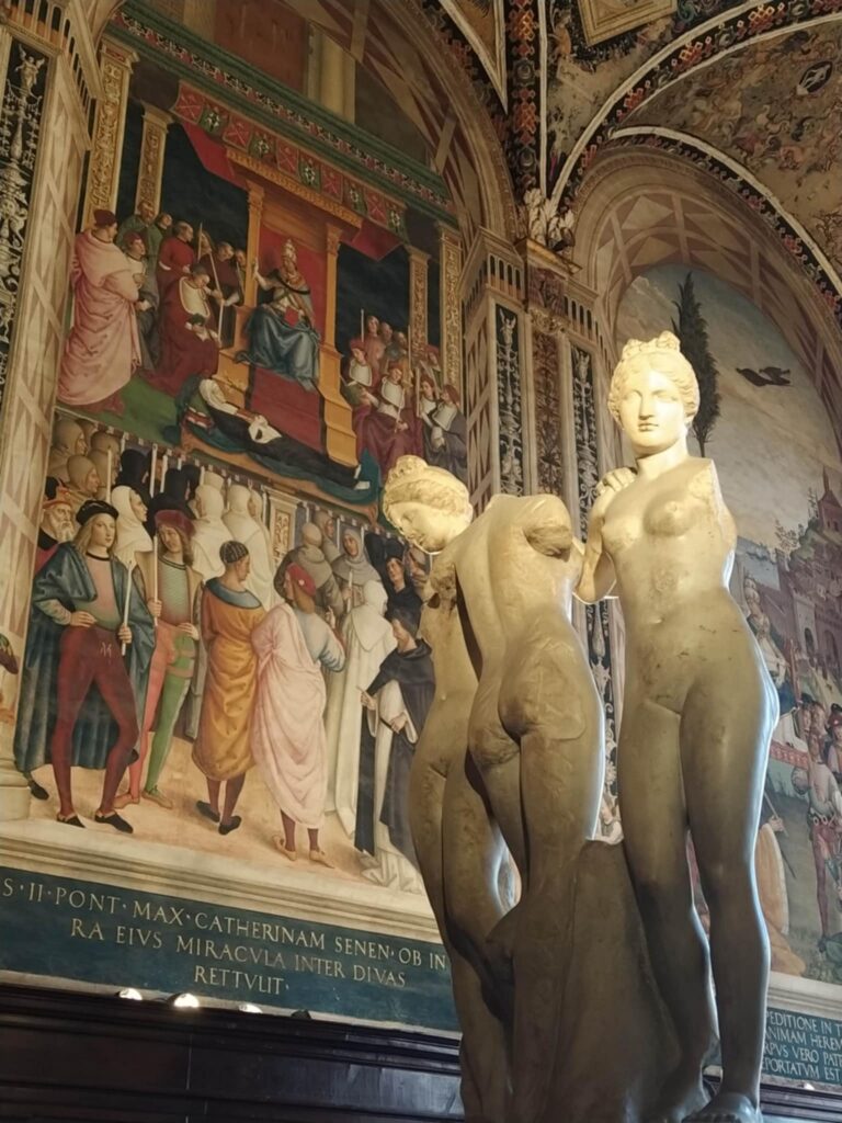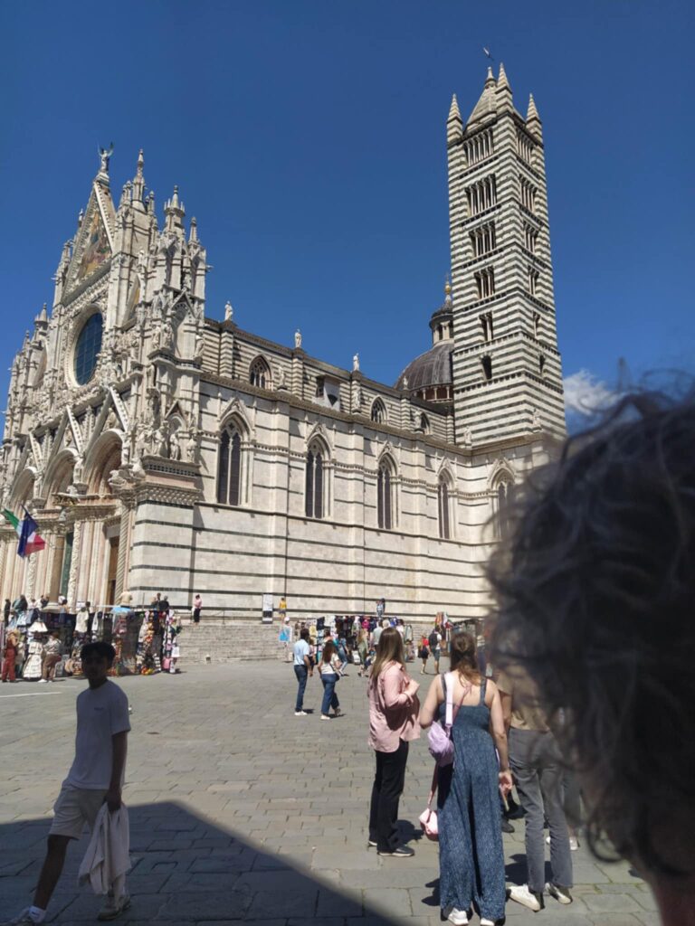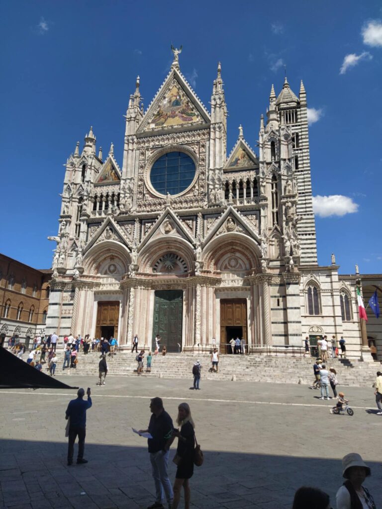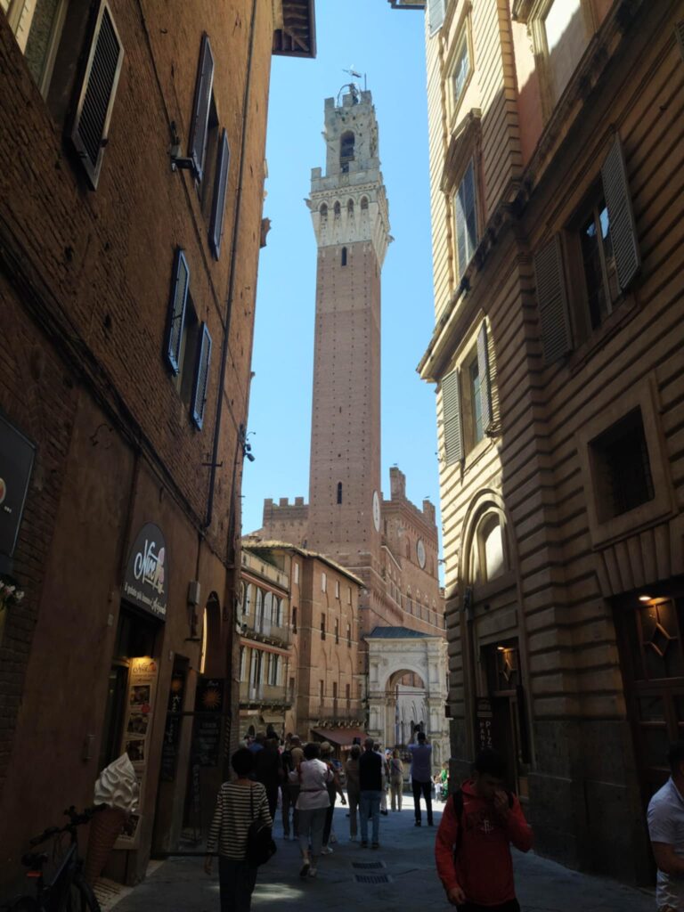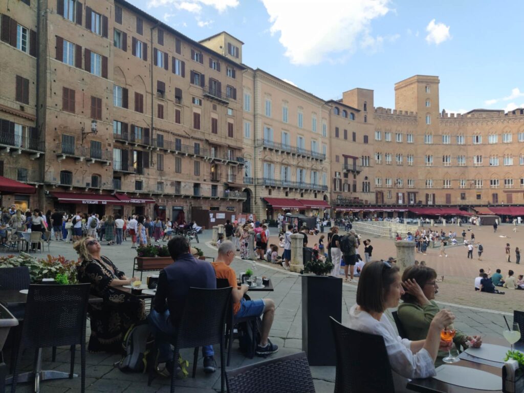 Hovedvejen førte os hurtigt de 10 km ind til Porta Romania, som vi erfarede var opført i 1100-tallet! Den snævre gade ledte os ind til Piazza del Campo, som vi genså med glæde. Vi har gode minder herfra, fra vi var her med Carina og Kristian tilbage i 2017. Fra en café over to kopper kaffe indhalerede vi stemningen på denne smukke plads formet som en muslingeskal. Den ene side af pladsen domineres af Palazzo di Pubblico, som Nyrop blev inspireret af, da han tegnede Københavns Rådhus.