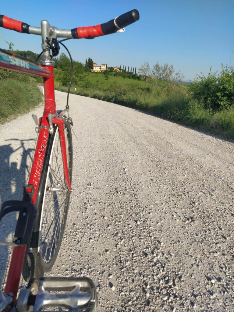På vej hjemad kom jeg til at tænke på, om vi måske boede i nærheden af ruten for cykelløbet Strade Bianche, som mine unger og jeg ivrigt følger i TV hvert år i marts. Jeg spurgte vores søde vært Victoria, som bekræftede, at løbet såmænd kører lige forbi hendes hoveddør! Tænk at jeg lige havde kørt på det selvsamme grus, hvor Pogacar, Van der Poel og Van Aert har kørt deres sejre hjem!!