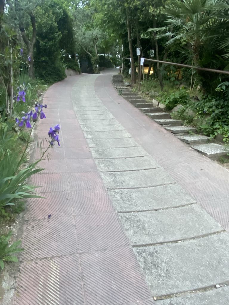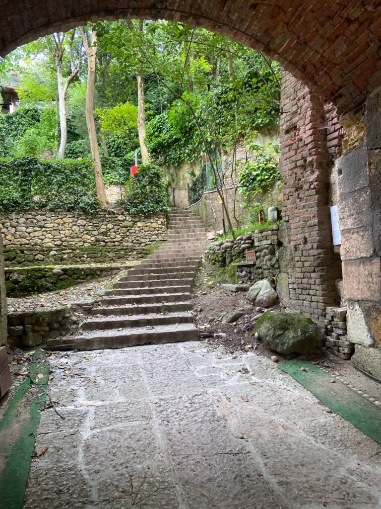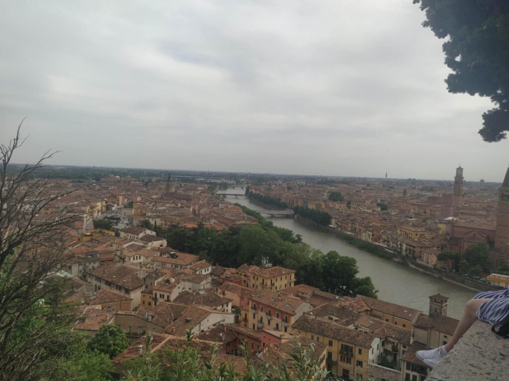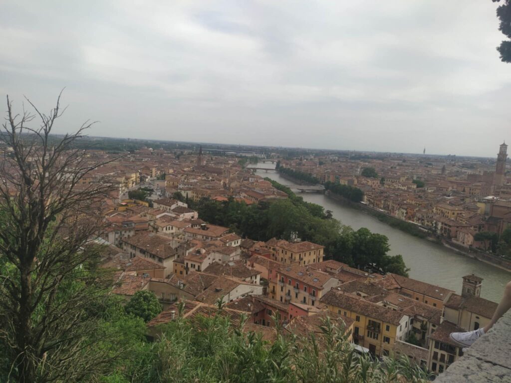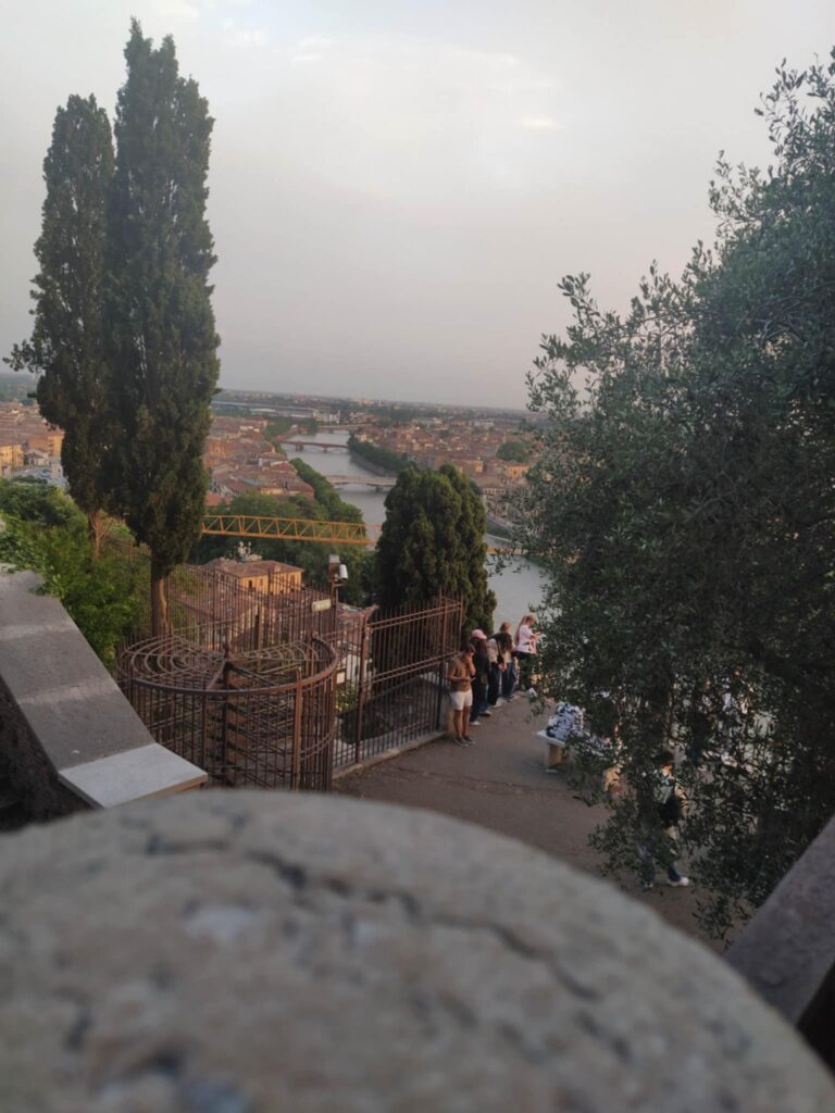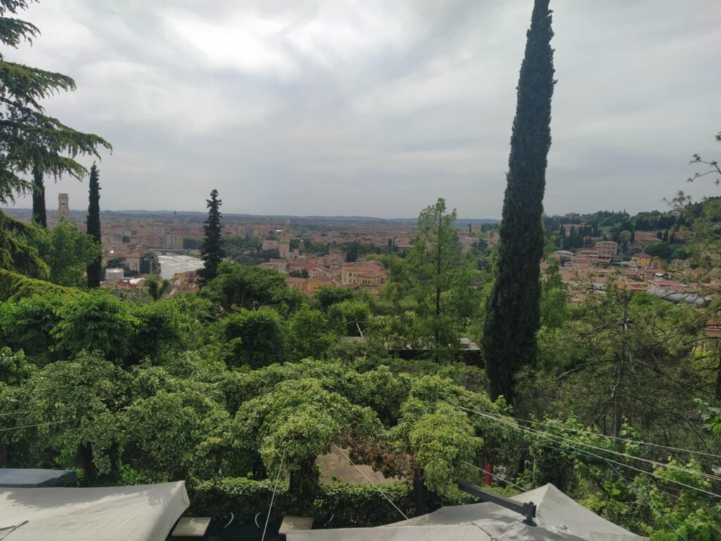 Der er 2 måder at komme fra pladsen til Verona city på en stejl nedtur på stier og små veje, eller en lille gåtur til Castel san Pietro, og derfra ned med en kabelbane, vi valgte det sidste.