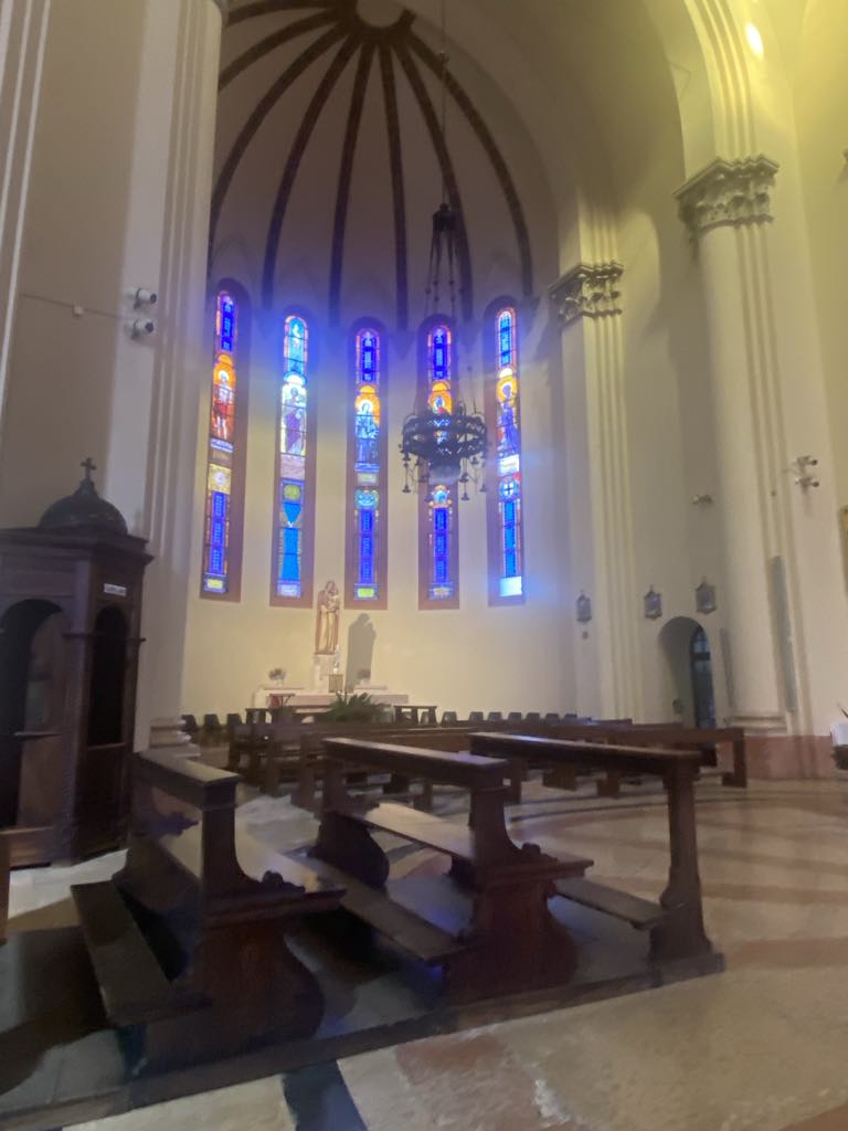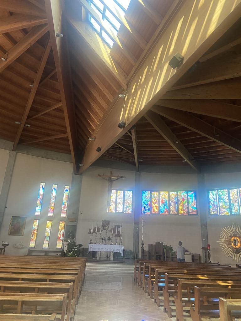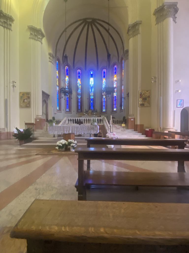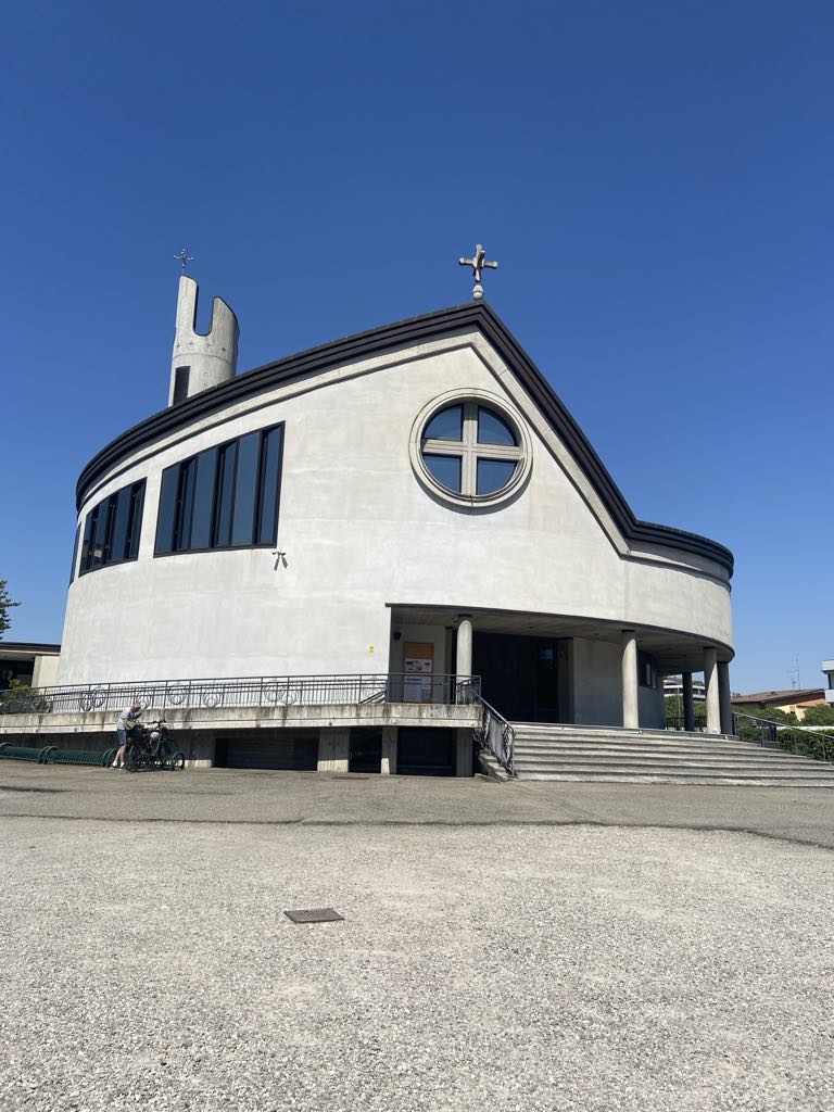 Kirken er opført i 1996, tegnet af Modena arkitekten Fabio Massimo Pozzi, og betegnes som et arkitektonisk mesterværk. Kirken har 2 store bronzedøre, som egentlig var fremstille til Modena katedralen, men kulturarvsministeriet afviste dem. Da vi trådte ind i kirken fik vi en følelse af at nutid og historie mødtes i rummet bla. ved hjælp af de meget fine mosaik vinduer.