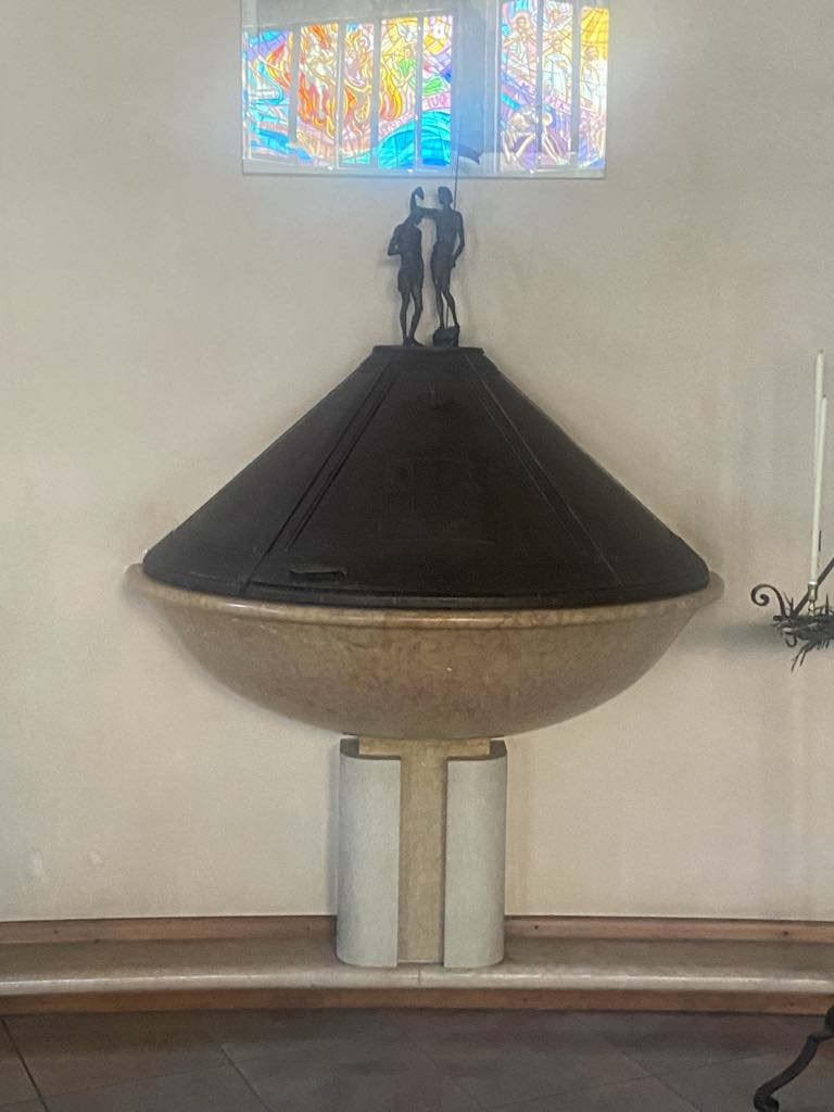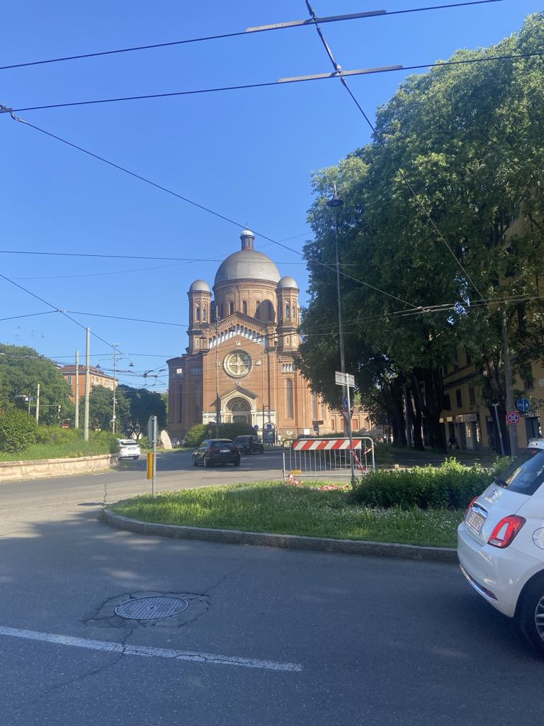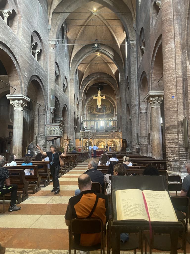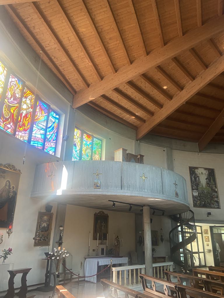 Kirken er opført i 1996, tegnet af Modena arkitekten Fabio Massimo Pozzi, og betegnes som et arkitektonisk mesterværk. Kirken har 2 store bronzedøre, som egentlig var fremstille til Modena katedralen, men kulturarvsministeriet afviste dem. Da vi trådte ind i kirken fik vi en følelse af at nutid og historie mødtes i rummet bla. ved hjælp af de meget fine mosaik vinduer.