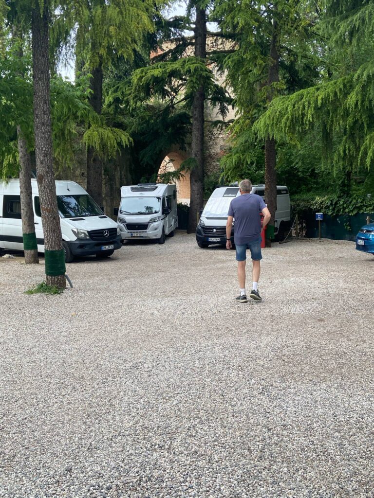 Vi ankom til vores plads i Verona, eller rettere ovenfor Verona ved 15 tiden. Det er en plads Rasmus og Laura opdagede, da de var i Verona for at par uger siden, og jeg må side det er et smukt og anderledes sted. Den ligger på en bjergside, med mange niveau forskelle, og det er mig en gåde, hvordan nogle af bilerne er kommet ind på deres pladser. Vi fik heldigvis en plads der var rimelig tilgængelig.