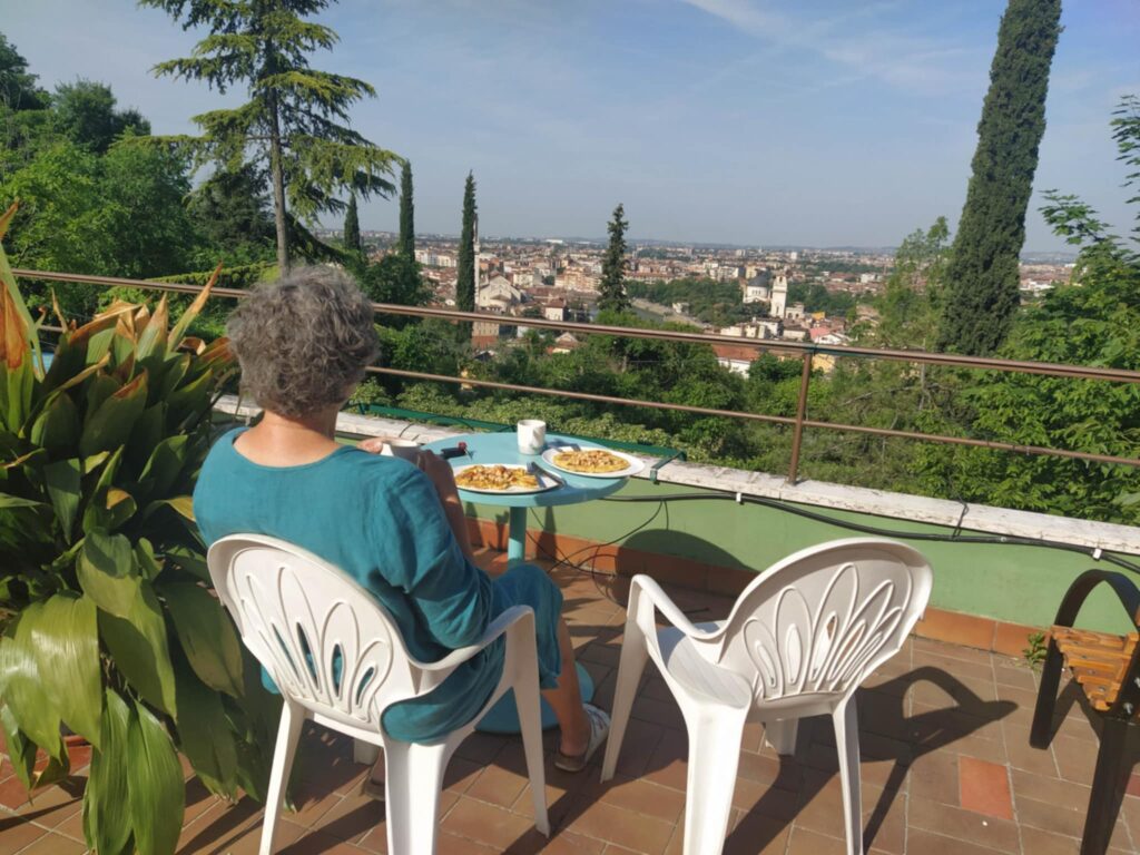 Enhver god dag starter med morgenkaffe og derefter morgenmad, vi nød begge dele med udsigt over Verona.