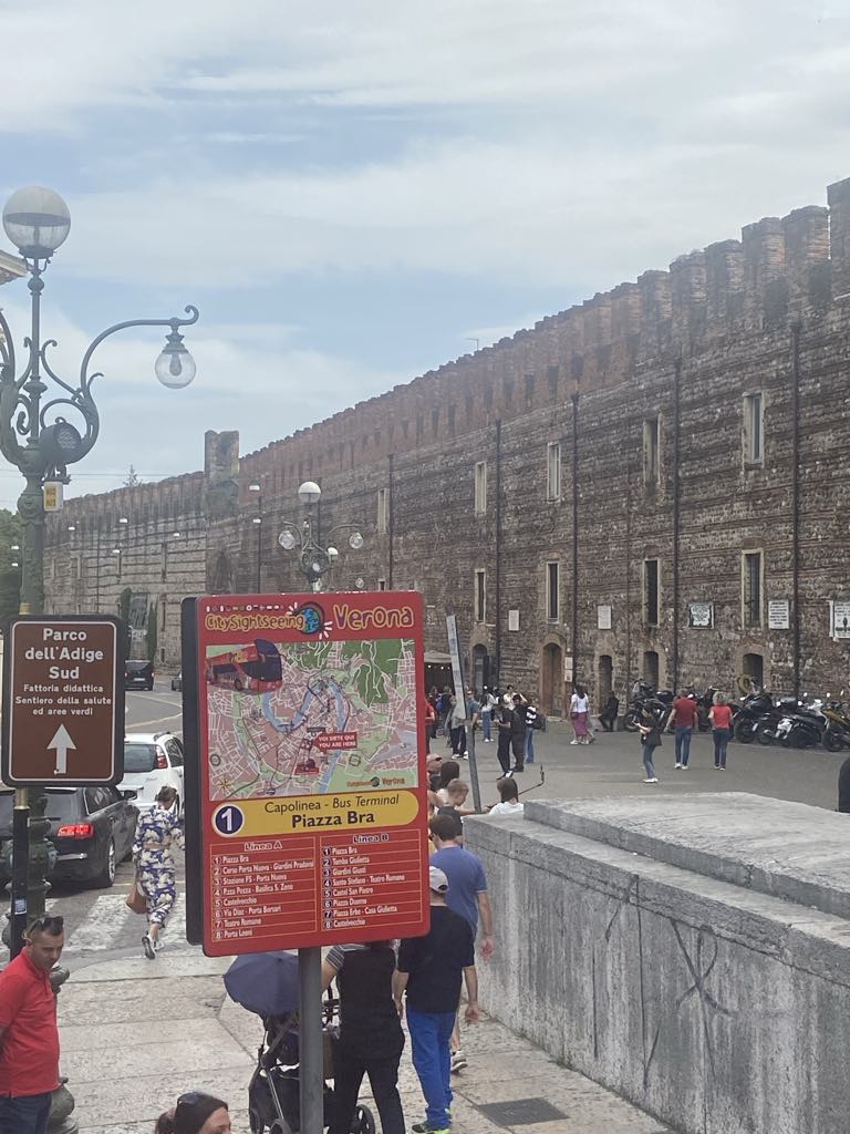 Vi slenterede gennem byen til turistinformationen for at købe biletter til Verona sightseeing, vi trængte til at andre viste os rundt.
